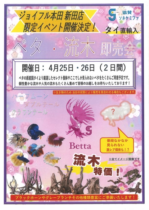 ベタの原産国タイより厳選したセレクト個体や、ここでしか見られないベタをたくさん、ご用意する予定です。個性豊かな流木や人気の流木もたくさん集めて皆様のお越しをお待ちしております!