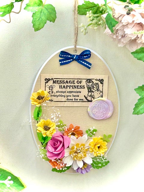 いろ紙で作ったお花とシーリングワックスなどを使って、春らしいミニサイズの壁飾りを作ります。