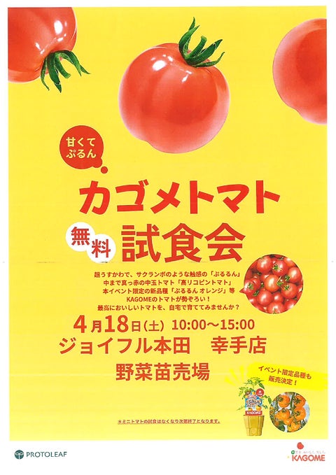 サクランボの様な食感の「ぷるるん」、中まで真っ赤な中玉トマト「高リコピントマト」、本イベント限定品種の新品種「ぷるるん オレンジ」等KAGOMEのトマトが勢揃い!最高においしいトマトを自宅で育ててみませんか?