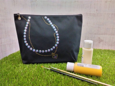 ポーチにエレガントなデザインの装飾を施します。アクリル絵具で描きますので、乾燥後は耐水性になります。トールペイントの技法をこの機会に学んでみませんか。